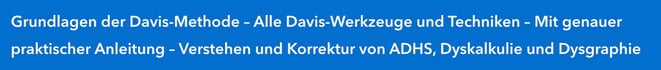 Dienstleistungen mit dem Namen Davis®, Davis®-Legasthenie-Programm, Davis®-Symbolbeherrschung, Davis®-Orientierungsberatung und Davis®-Dyskalkulie-Programm dürfen ausschließlich von Personen verwendet werden, die durch die Davis Dyslexia Association International als Davis-Berater/in ausgebildet und lizenziert worden sind. Die Bezeichnung Davis®-Lernstrategien für Fortbildungen oder für Begleitung von Mentorenprogrammen für Schulen und/oder Lehrer erfordert die Lizenz durch Warenzeichenhalter Ronald D. Davis.